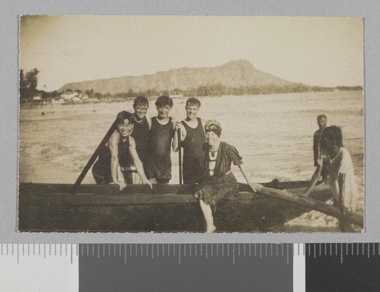 Jack London, Nakata, Martin Johson, and a few unidentified men stand next to an outrigger canoe on beach.
