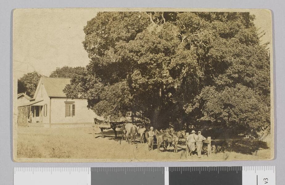 Jack London and a group of men wear bonnets, one wears a cloak. They stand outside cottage on Jack London Ranch.
