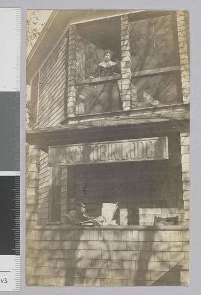 Ninetta "Netta" Wiley Eames Payne stands in front of porch of Wake Robin Lodge.
