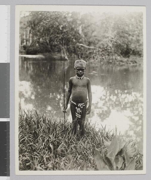 An indigenous Oceanian man stands with a bow and arrow in hand.