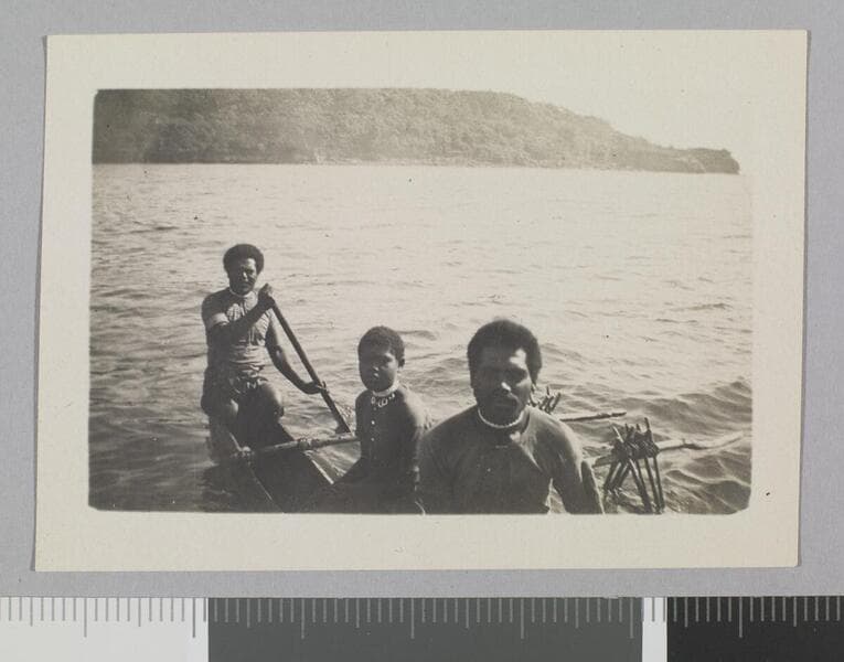 Three indigenous Oceanian men stand on deck of the Snark.