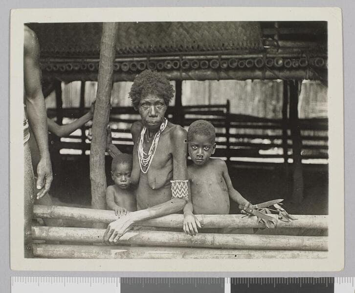 A group of about two dozen indigenous Ni-Vanuatu men stand facing toward camera, in clearing in front of a wooden structure.