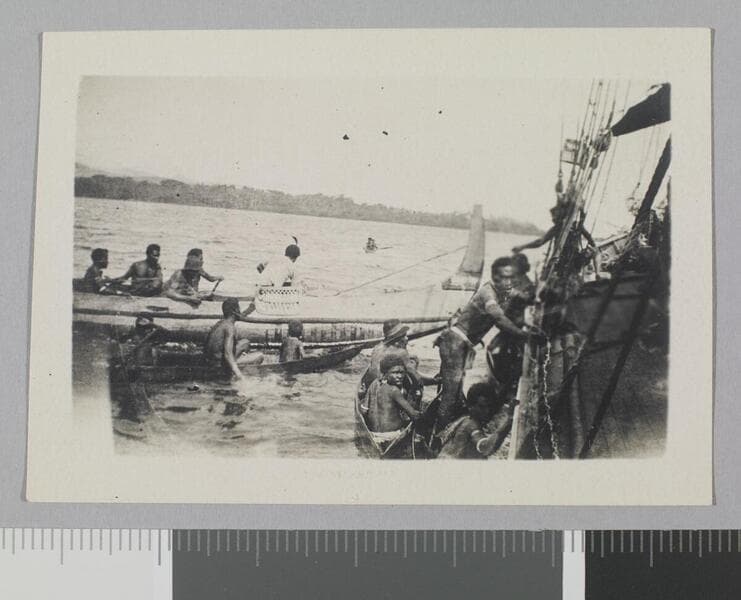Two indigenous Oceanian men and one child ride in outrigger canoe.