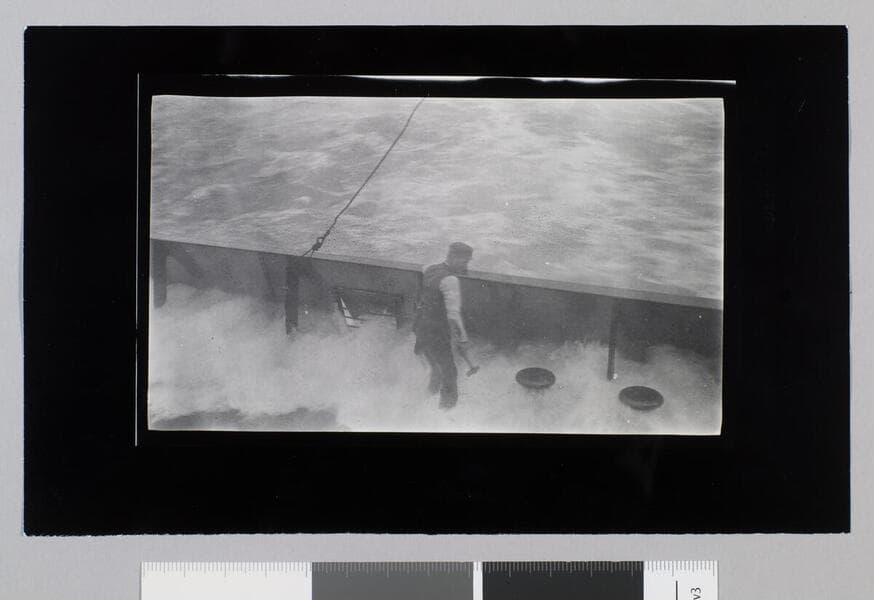 A sailor with a saw works on a lower deck on the ship Mexicano. Deck chair and ocean in the background.