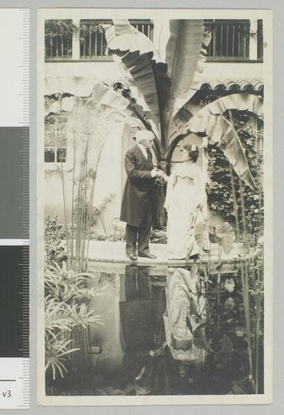 Edward Biron Payne and Ninetta Wiley Eames Payne on their wedding day. They stand in front of a large palm at the edge of a reflecting pool.