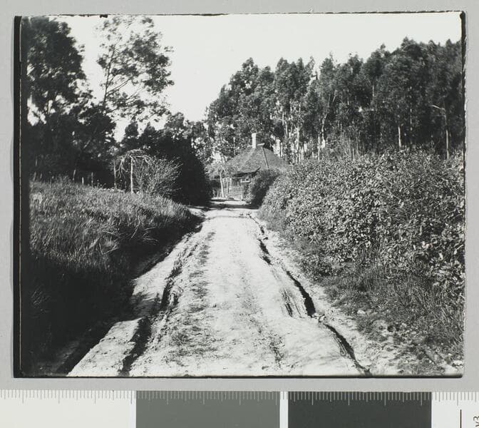 Image of a dirt road leading to a motion picture set presumably on the Columbia Ranch in Burbank, California, with a European village and castle.