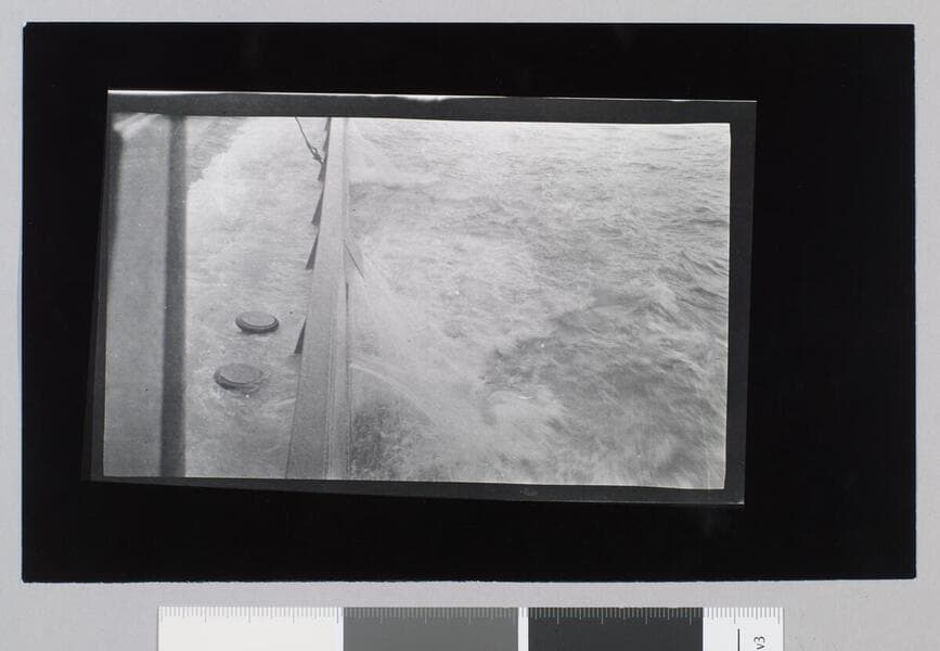 A young sailor holding a rag stands on deck of the ship Mexicano. Bow of ship and ocean in background.