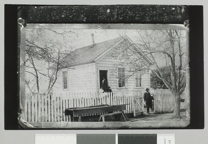 Charmian London stands with a horse outside the cottage at Beauty Ranch. Jack London is partially visible sitting on the porch steps behind her.