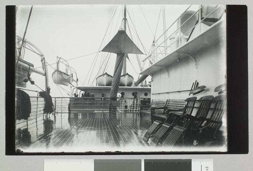 A row of people sit on deck chairs on the steam ship RMS Majestic.