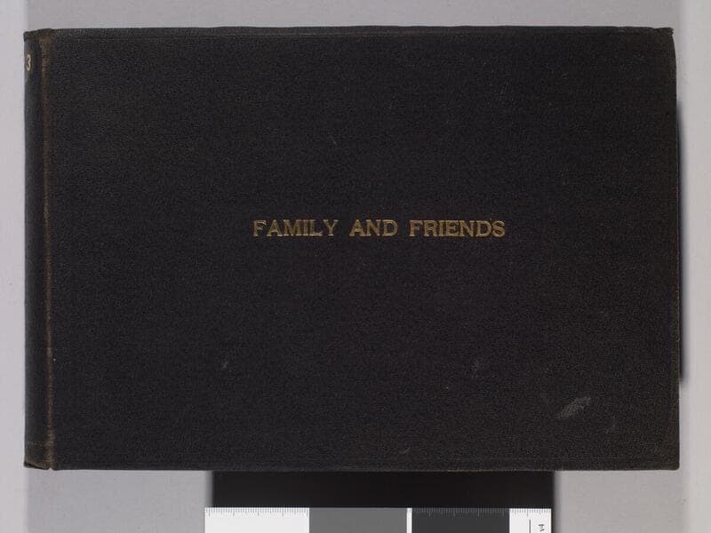 Album is bound in textured black material. Title "Friends, Old Friends." is embossed in gold on the upper center of cover, and a fleur de lis graphic element is blind embossed underneath it. Two embossed lines border the outer edges of cover. The number "15" is affixed to the top of spine with glue. Contains photographs of London's friends, including Bohemian Grove cohorts, and some of Charmian London's family.