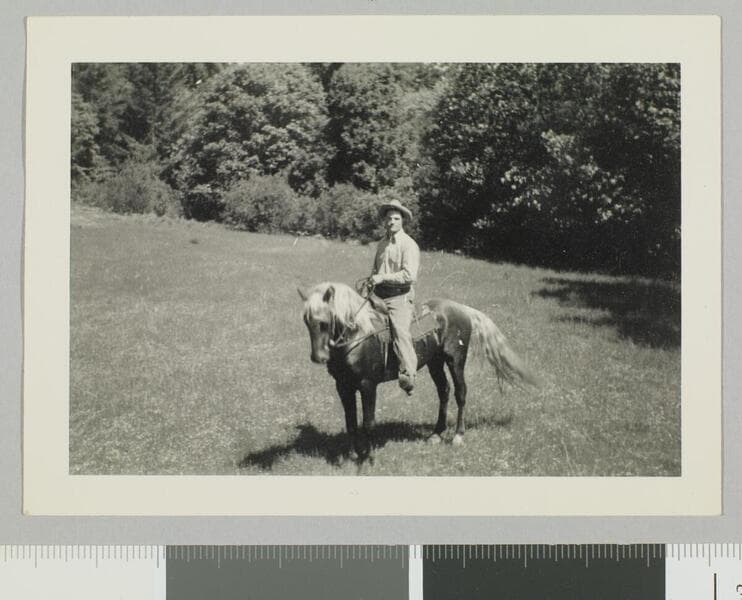 Charmian London sits sidesaddle on draft horse on Jack London Ranch.