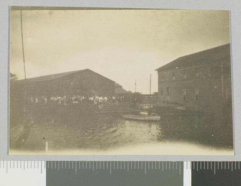 Two indigenous Oceanian men stand on deck of the Snark with lifeboat and rigging behind them.