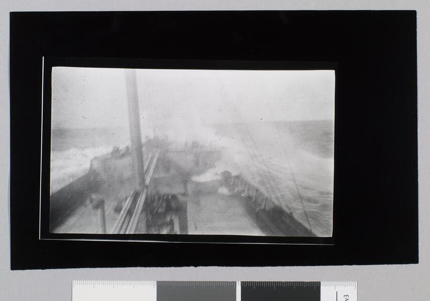 A young sailor holding a rag stands on deck of the ship Mexicano. Bow of ship and ocean in background.