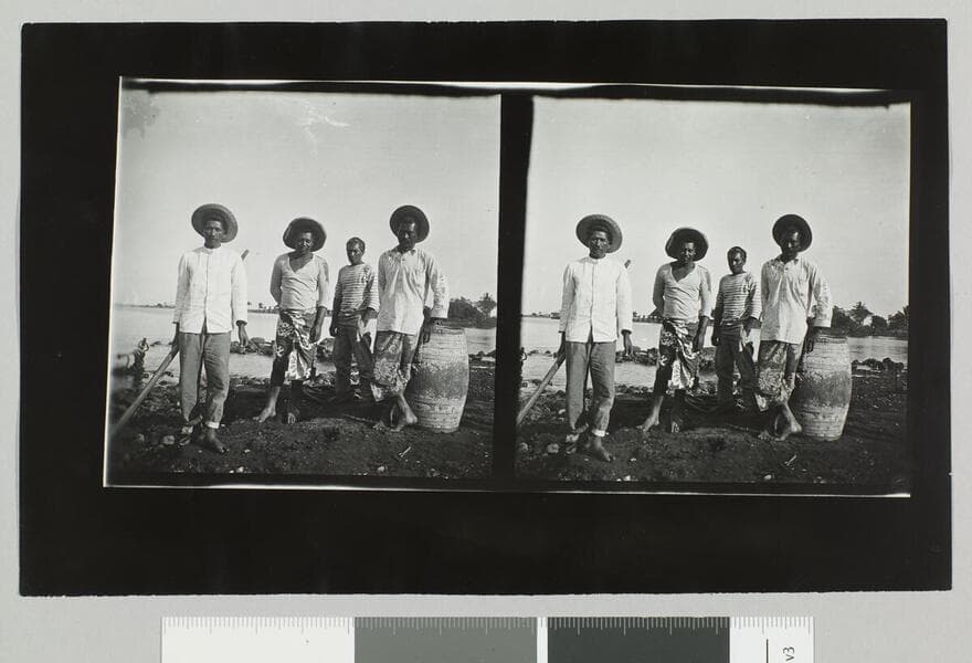 Several groupings of men on skiffs and on shore wearing white clothing and hats. A long skiff with barrels attached to sides in center of photo. Two men sand above on sail rigging. Shore and wooden buildings in background.