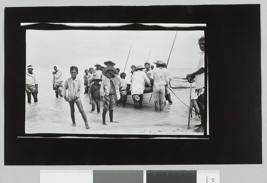 Several groupings of men on skiffs and on shore wearing white clothing and hats. A long skiff with barrels attached to sides in center of photo. Two men sand above on sail rigging. Shore and wooden buildings in background.