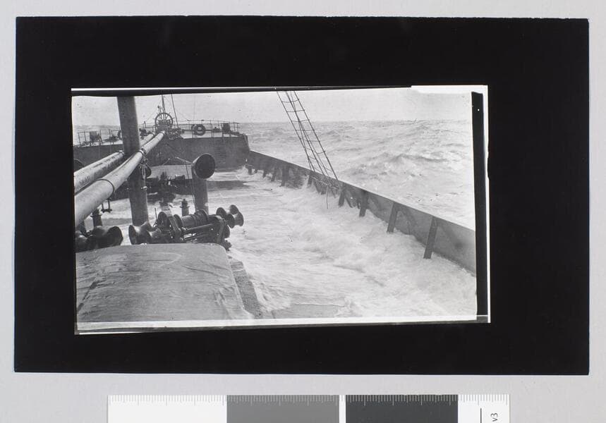 A sailor with a saw works on a lower deck on the ship Mexicano. Deck chair and ocean in the background.