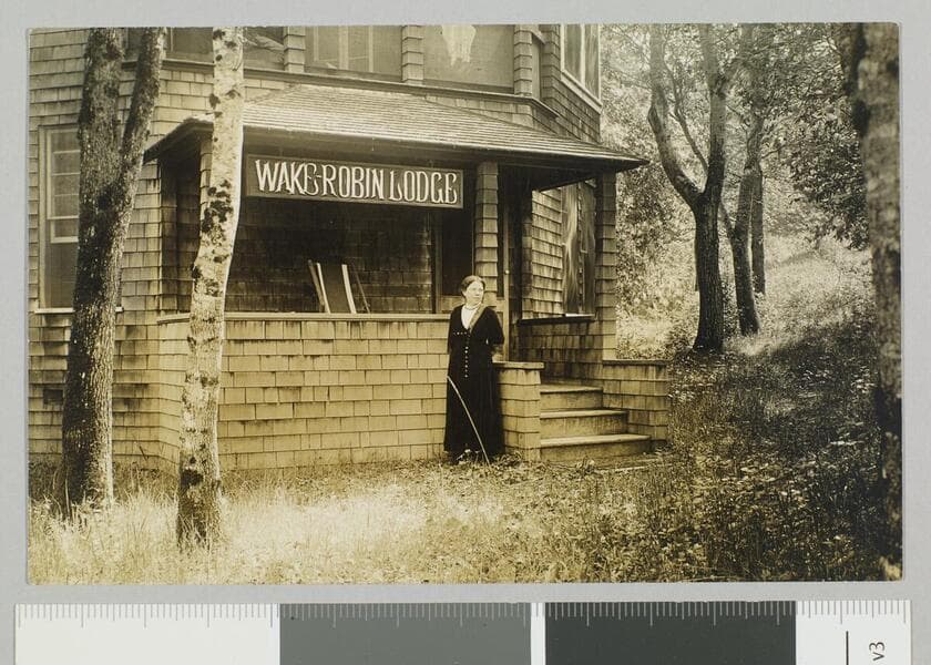Edward Biron and Ninetta Payne stand in front of the porch of Wake Robin Lodge.