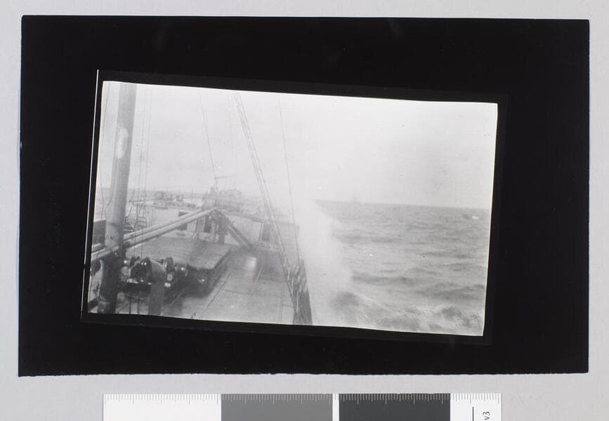A young sailor holding a rag stands on deck of the ship Mexicano. Bow of ship and ocean in background.