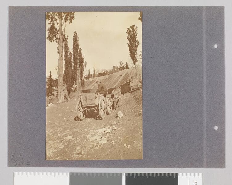 A two-wheeled donkey-drawn cart sits in front of two houses in an arid landscape.