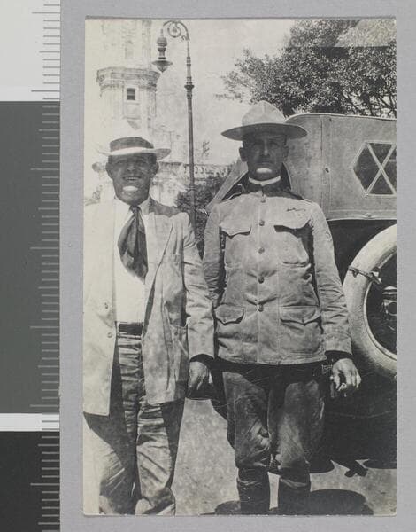 Jack London, in a white suit smoking a cigarette, and an unidentified man stand in front of automobile.