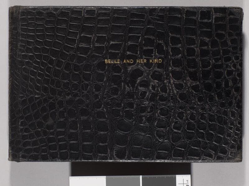 Bound in black faux alligator material. The title, "Maine to Jamaica 1906-06," is embossed on the center of the cover in gold lettering. The number "44" is affixed to the top of spine with glue. Photos are primarily travel shots of Maine and Jamaica during the Londons' honeymoon, including rural immigrant villages in the Blue Mountains. Also some postcards of scenery around Mt. Island, Maine.
