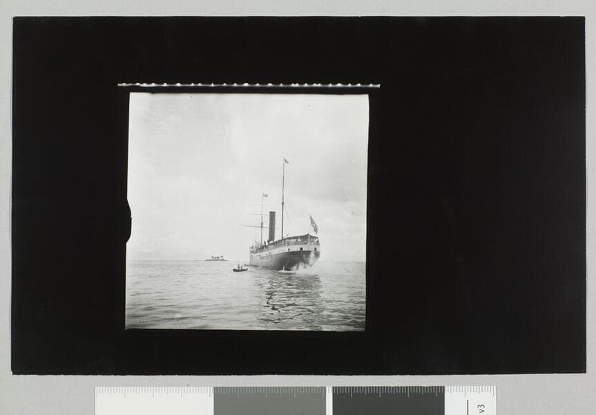 Ship captain stands in a skiff with four oarsmen rowing in water. Another boat's sail is partially visable.