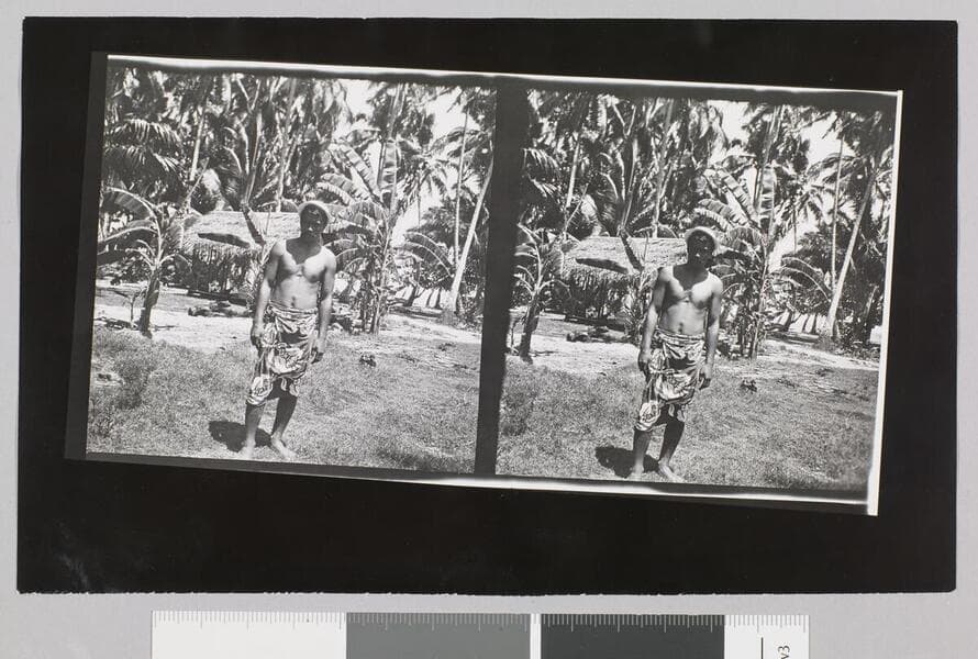 An indigenous Malaitan man stands and looks at a can of food he is holding.