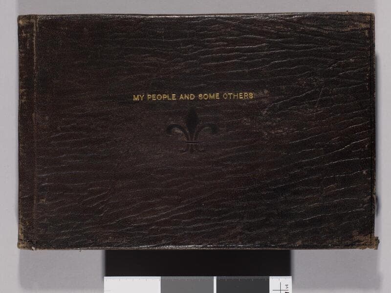 Bound in textured black material. A fleur de lis graphic element is embossed in center of cover, and the title "Persons and Places" is embossed in gold lettering below it. The number "38" is affixed to the top of spine with glue. Photos are of Jack and Charmian London, friends and family, the Growall home in Menlo Park, clippings, and mementos.