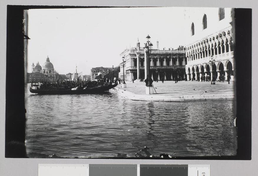 Men, women, and children stand and kneel to feed pigeons in Piazza San Marco, Venice. Front of St. Mark's Basilica is seen in background.