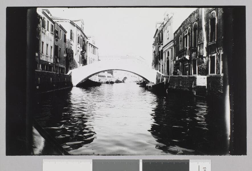 A bridge over a canal in Venice, California, where the Venice Short Line electric railway ran. A business sign can be seen in the distance (illegible).