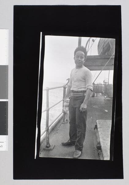Sailor with paintbrush turns to look at camera on the ship Mexicano.