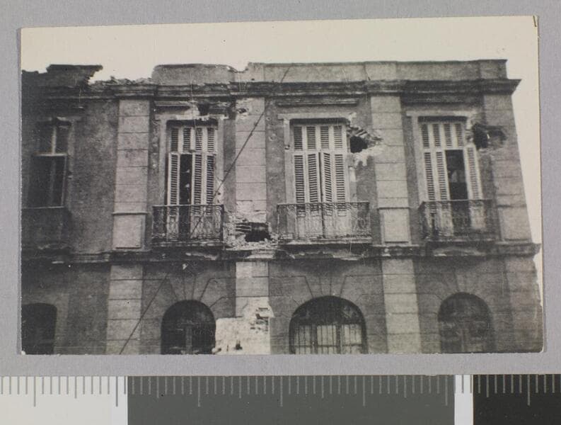 View of the damaged facade and stained glass windows of the First Christian Church at Marengo Avenue and Walnut Street in Pasadena, California, following a tornado on January 26, 1918. Bricks from the facade of the building have been blown off exposing wood frame beneath and rubble is scattered on the ground.