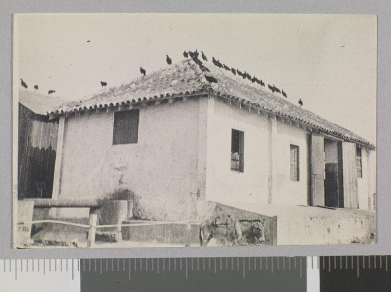 A long building with awning and men on roof. Men also climb up ladder to roof.
