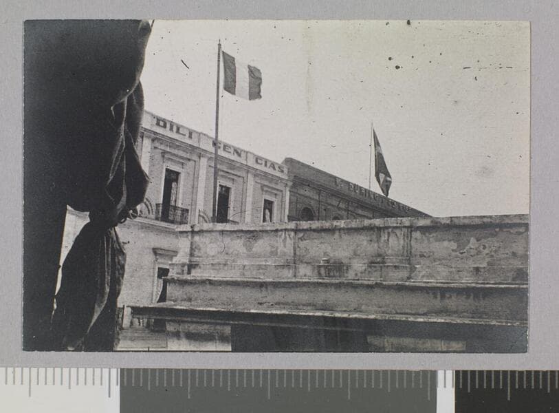 The Municipal Palace flying the American flag, pedestrians, and men on horseback in the Plaza de Armas, Veracruz, Mexico.