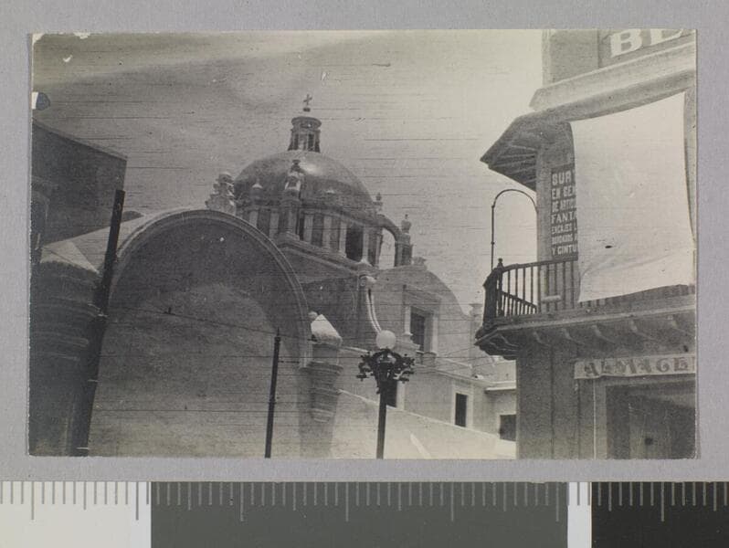 A building with word "Diligencia" on the facade, with a Mexican flag flying in front, view from a window with curtains.