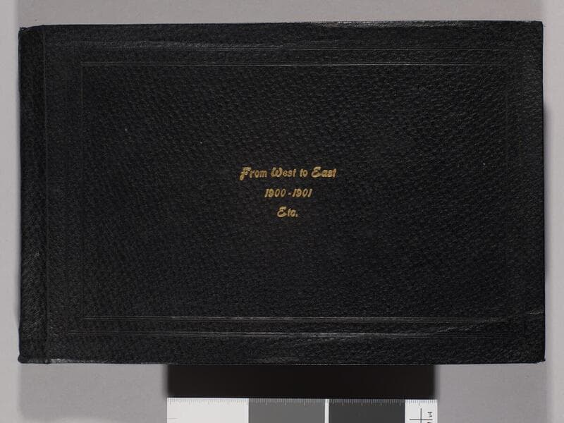 Bound in textured black material. The title "Boats" is embossed in center of cover in gold lettering. The number "74" is affixed to the top of spine with glue. Images are mostly clippings and illustrations of ships compiled my Charmian London after Jack London's death. A few photos of Jack and Charmian with George Sterling, and crew of the yacht Fidra.