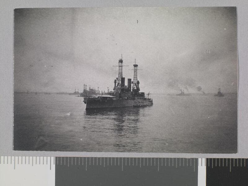 Several US battleships out in open water off the coast of Veracruz, Mexico.