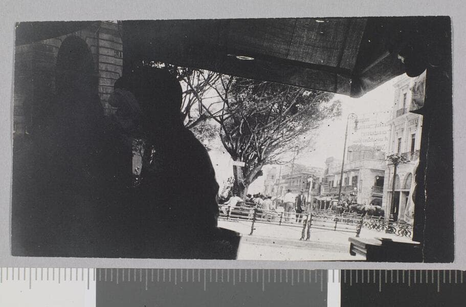 US servicemen on horseback and walking in the Plaza de Armas in Veracruz Mexico with the Municipal Palace visible in background.