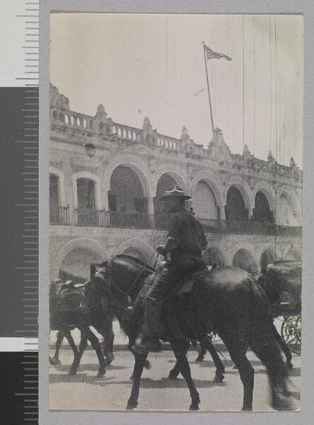 US servicemen on horseback and walking in the Plaza de Armas in Veracruz Mexico with the Municipal Palace visible in background.