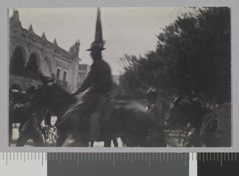 US servicemen on horseback and walking, move through the Plaza de Armas in Veracruz, Mexico. Trees in the middle of the square in background.