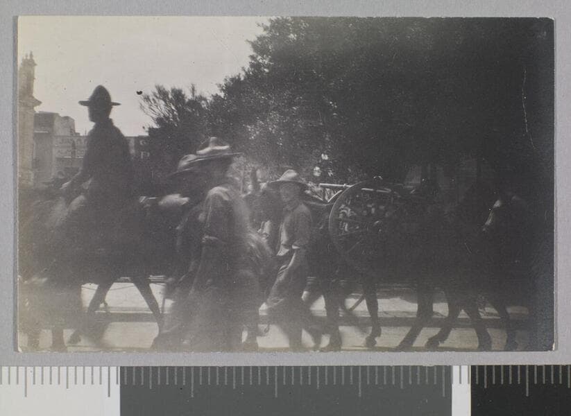 US servicemen and horses walk through the Plaza de Armas in Veracruz, Mexico. Trees in the middle of the square in background.