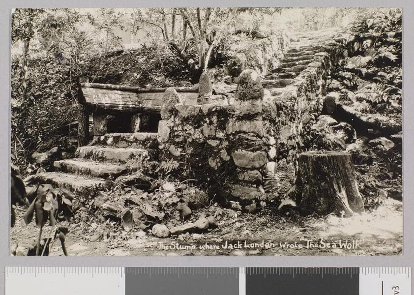 A tree stump sits in a grove of oak trees and forest foliage.