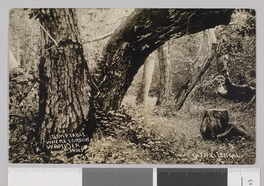 A grove of what appears to be oak trees. The tree at center has notches carved into the trunk.
