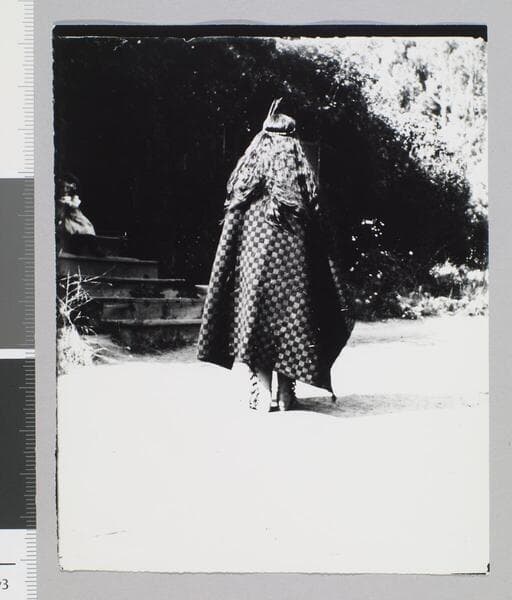 Charmian London, Jack London, and Beth Wiley Baxter stand on porch of the Growall home in Menlo Park. The two women are dressed in elaborate outfits.