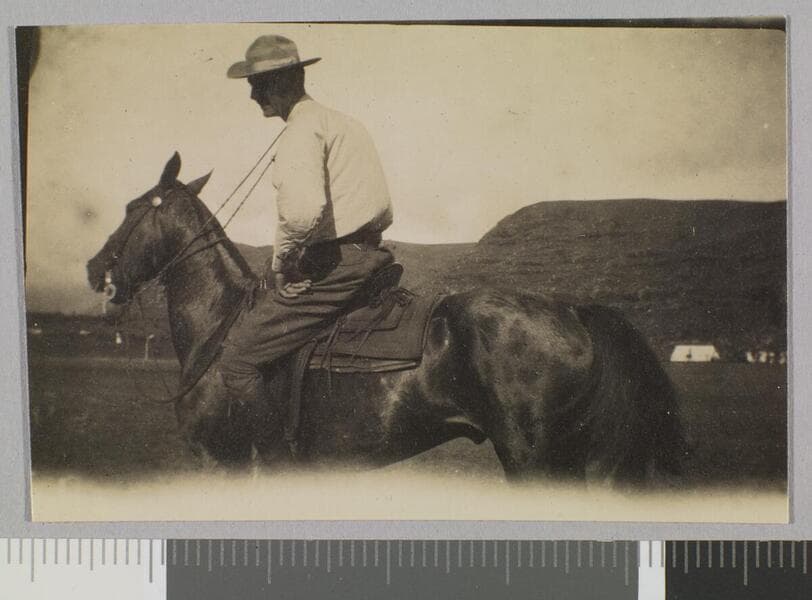 Jack London sits on a dark horse in a field of grass, with a view of hills and a valley in the background.