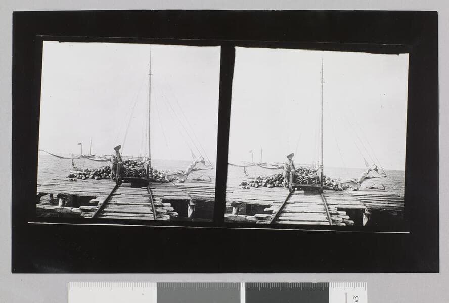 A indigenous man stands on board the Snark with sails and rigging behind him.