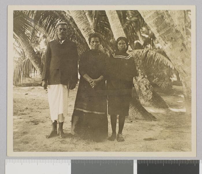 Jack and Charmian London sit on bench facing each other wearing bathing suits. Palm trees in background.