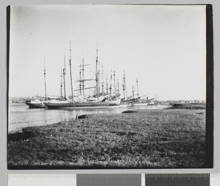[Pierce 05662 -05667 forms a panorama]. View of the dock and sailing ships in the harbor.