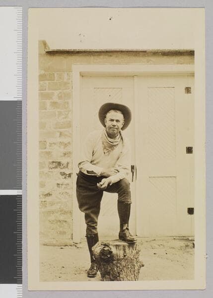 Barn building under construction on Jack London Ranch. One man in hat stands in front beside a ladder.