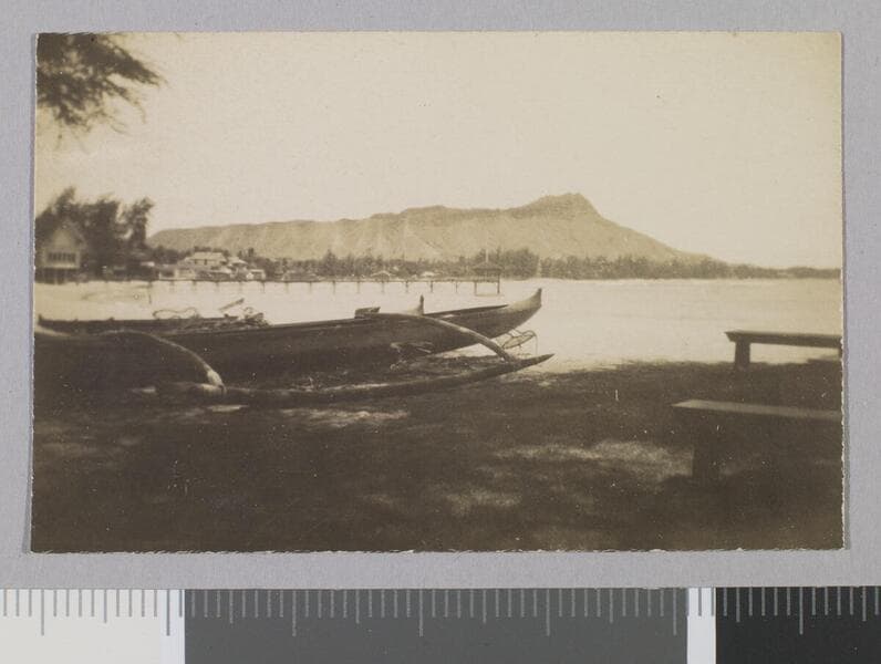 An outrigger canoe with sail in Honolulu Bay with Diamond Head in the distance.